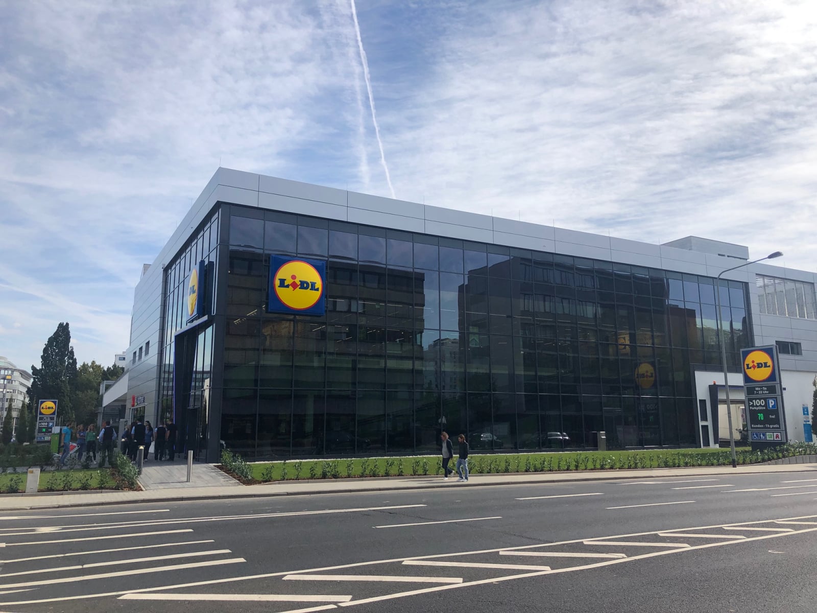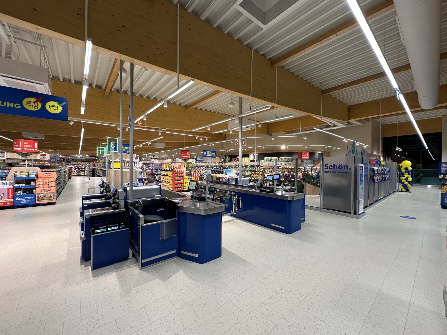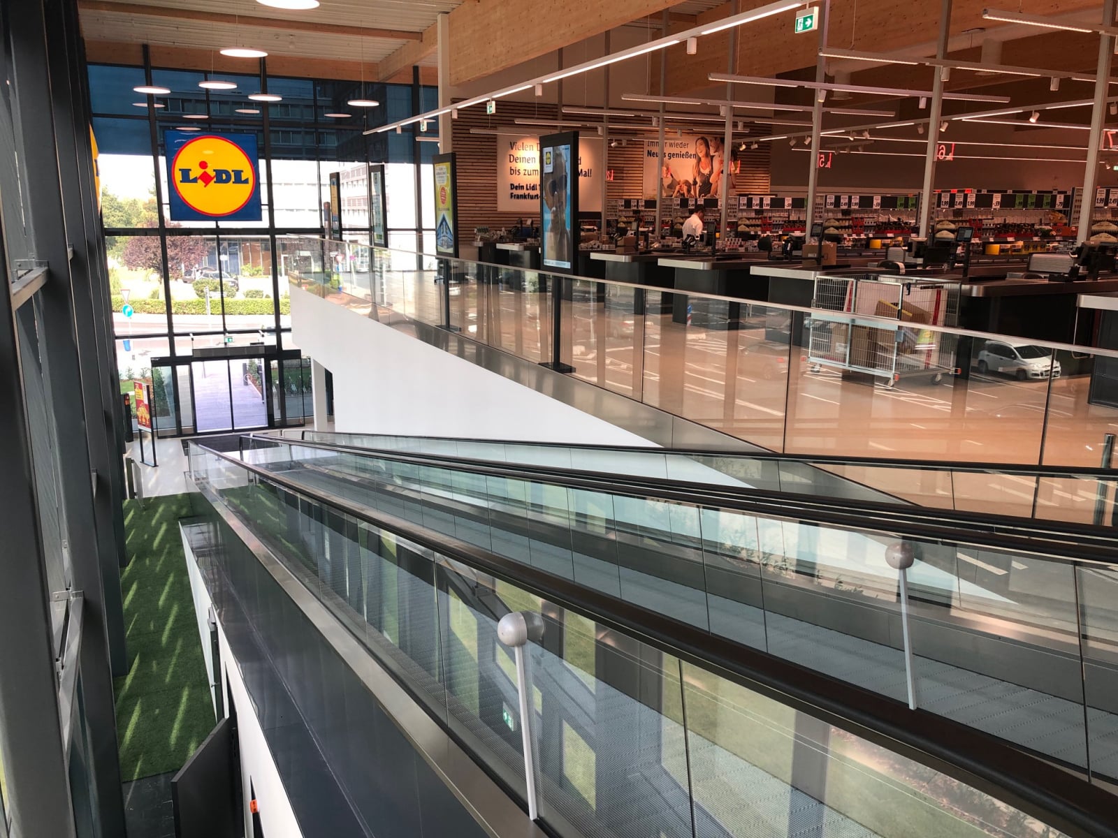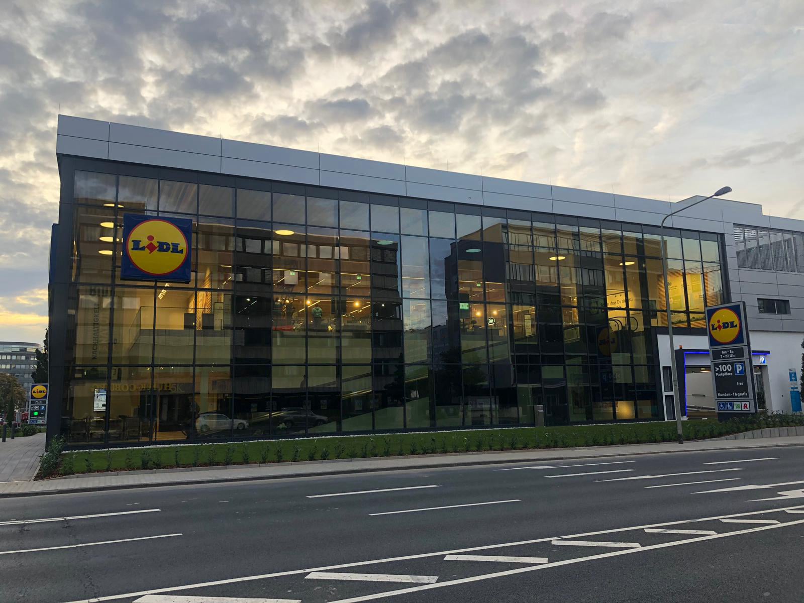 Helle und großzügige Verkaufsfläche - Große Glasfronten bestückt mit elektrochromen Gläsern der Firma Sageglas sorgen für einen hervorragenden Blendschutz an den Kassenbereichen. Durch die Verdunkelung erfolt eine Reduzierung des Wärmeeintrags.