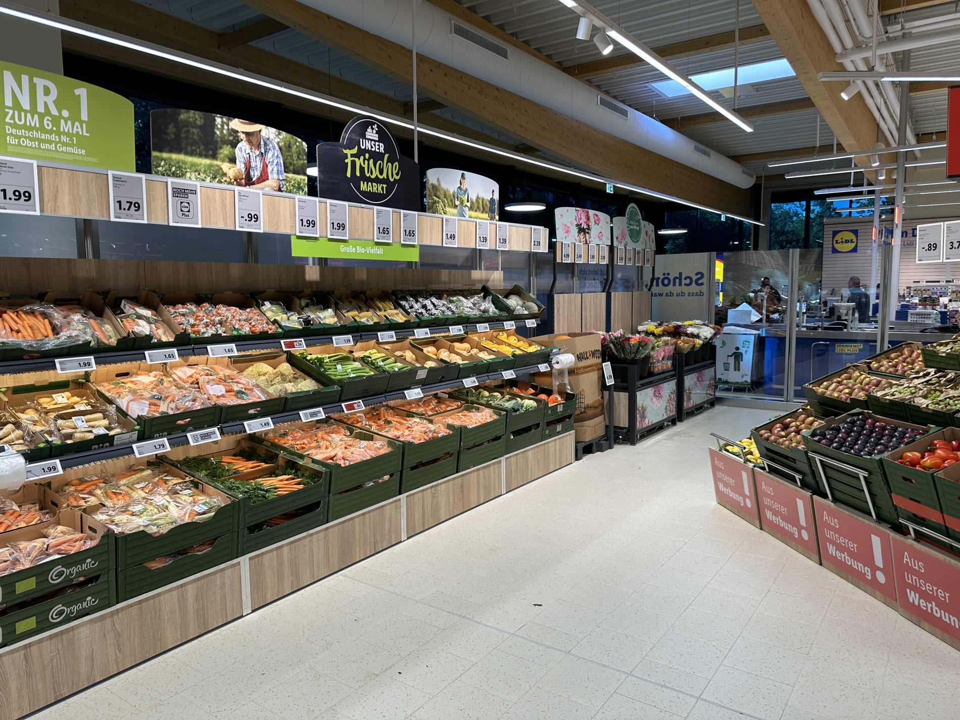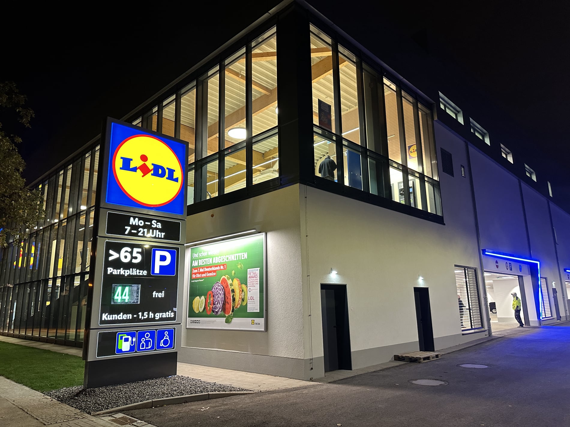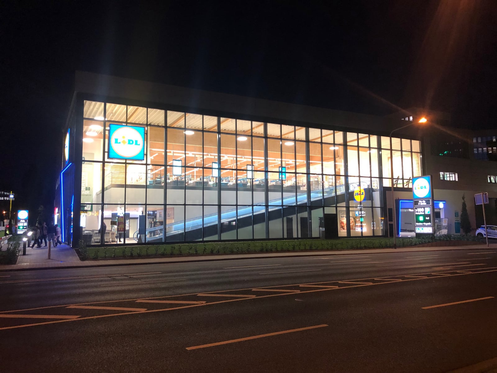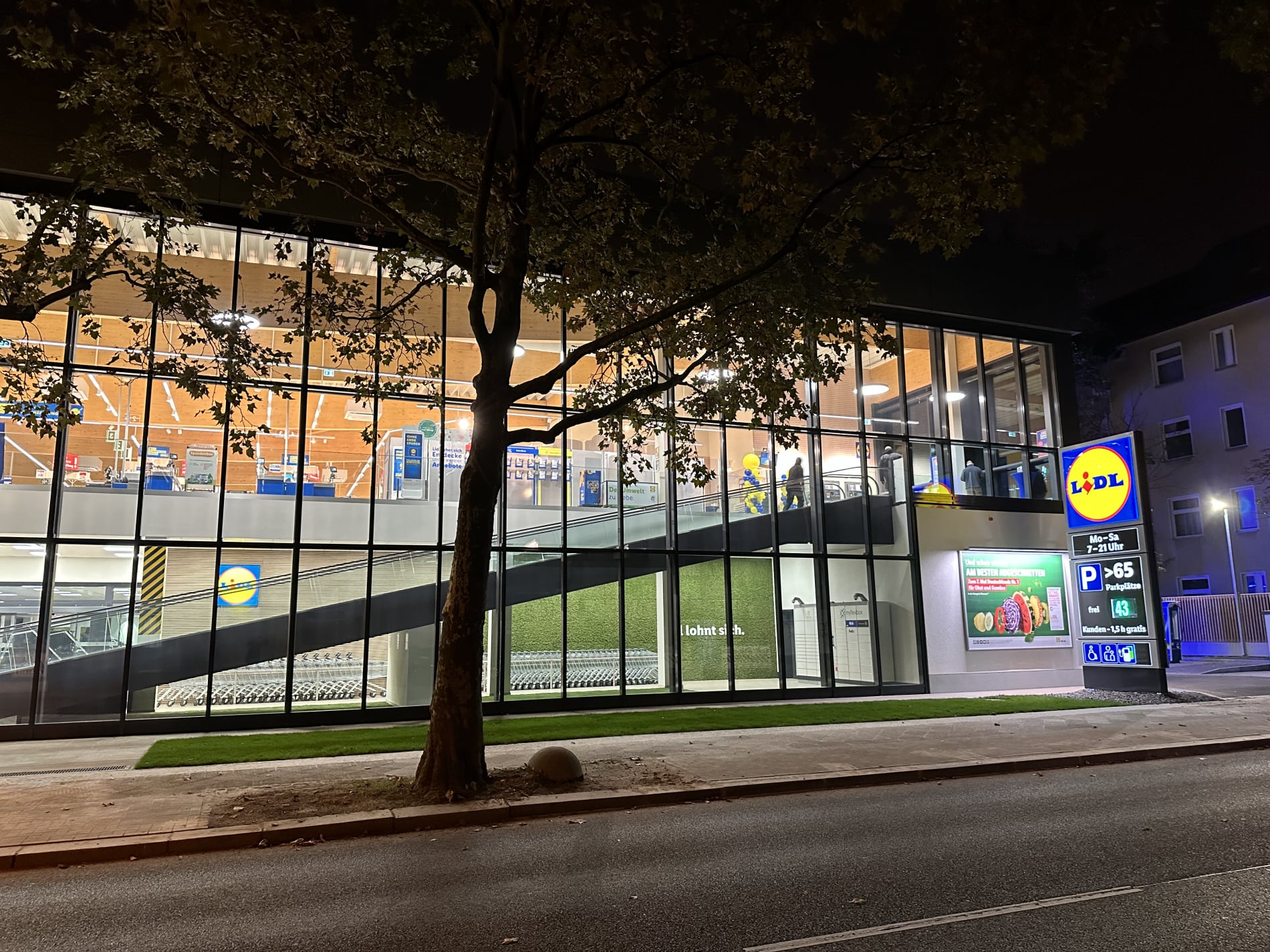 Helle und großzügige Verkaufsfläche - Große Glasfronten bestückt mit elektrochromen Gläsern der Firma Sageglas sorgen für einen hervorragenden Blendschutz an den Kassenbereichen. Durch die Verdunkelung erfolt eine Reduzierung des Wärmeeintrags.